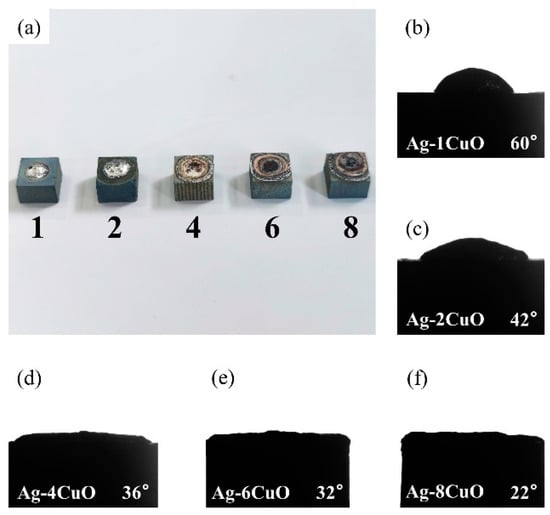Contact angles of Ag-CuO fillers on TiAl: (a) macroscopic appearance of the specimens, (b) Ag-1CuO, (c) Ag-2CuO, (d) Ag-4CuO, (e) Ag-6CuO, and (f) Ag-8CuO.