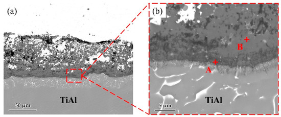 The element distribution at the interface of the joint is shown in Figure 8. As shown in Figure 8b,c, Ag and Cu elements mainly distributed in the middle of the brazing seam. Figure 8d–f shows that an oxidation layer mainly composed of Ti and Al oxides formed on the interface. A small amount of Ti and Al oxides diffused and dispersed in the middle of the brazing seam. A diffusion layer formed between the oxide layer and the substrate due to the outward diffusion of Ti and Al. In order to analyze the element distribution of the diffusion layer in detail, a line scanning of the interface was performed, as shown in Figure 9. The Ti/Al oxide layer can be divided into two parts. On the outer side Ti content was slightly higher than that of Al, and the inner side was an Al-rich phase. A phase with high Ti content appeared between the oxide layer and TiAl. Such distribution of outer TiO2-rich layer and inner Al2O3-rich layer correspond well with previous research [33,34,35]. The rapid external diffusion and high oxidation rate of Ti resulted in the higher TiO2 content in the outer layer and formed an Al-rich layer inside. At the same time the rapid oxidation of Ti led to low oxygen partial pressure inside the TiO2-rich layer. The higher aluminum content and lower oxygen partial pressure in this region led to the selective oxidation of Al, forming an Al2O3-rich layer. A part of the aluminum in this phase came from the outward diffusion of Al from the base metal, which resulted in a phase with high Ti content appearing between the oxide layer and TiAl.