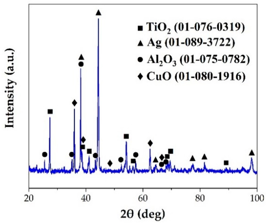 The joined base-metal was a γ-TiAl alloy with a nominal composition of Ti-46Al-2Cr-2Nb (at. %) obtained from Grinm Group Co. Ltd. The SEM image and the XRD pattern of TiAl alloy are shown in Figure 1. The alloy is mainly composed of lamellar γ-TiAl and α2-Ti3Al phases. TiAl alloy was cut into pieces of 5 mm × 5 mm × 5 mm and 15 mm × 5 mm × 5 mm. The surfaces of TiAl alloy were polished and ultrasonically cleaned for 10 min. The RAB filler consisted of Ag and CuO powders, which were purchased from Beijing Xingrongyuan Technology Co. Ltd. and had a purity of 99.95% and 99.9%, respectively. Table 1 lists the filler alloy composition used in this study. Ag and CuO powders were ball milled for 4 h to prepare the Ag-CuO fillers. The milled fillers were pressed into sheets with the thickness of ~100 μm. Then the filler sheet was sandwiched between two base metals. A normal load of 1 kPa was applied to the assembly to maintain a proper contact. The brazing procedure was conducted in air atmosphere in a muffle furnace (KSL-1200X, HF-Kejing). The assembly was heated to the brazing temperature at the rate of 10 °C/min, held at brazing temperature (970~1050 °C) for 20 min, and then furnace cooled to room temperature. In addition, a small amount of the Ag-CuO fillers of different compositions were individually placed on the surfaces of TiAl, which were then heated at the same rate to 1020 °C, holding for 20 min, to prepare the specimens for contact angle tests. The contact angle of the specimens after cooling to room temperature was measured.