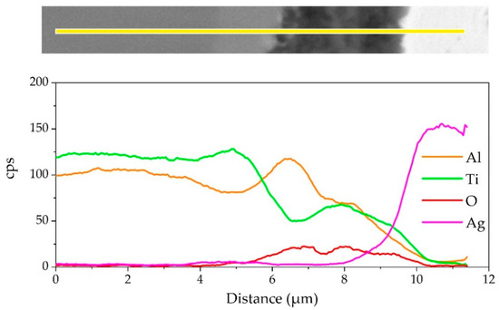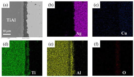 EDS map scanning result of the interface: (a) SEM image of the interface. The corresponding EDS maps from Figure 6a: (b) Ti, (c) Al, (d) O, (e) Cu, (f) Ag.