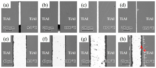 Brazing temperature is known as one of the most important factors affecting the brazing process. As a result, the influence of brazing temperature on the microstructure of the joints was analyzed. Figure 10a–d shows the interfacial structure of the joints at different brazing temperatures for 20 min. Figure 10a,b indicates that as the temperatures were low at 970 and 1000 °C, the fluidity of the brazing filler was relatively poor and voids could be observed in the joints. As shown in Figure 10c,d, when the brazing temperature was high enough, the fluidity of the brazing filler was improved and joints without macroscopic defects could be achieved. Figure 10e–h shows the detailed microstructure of the joints in Figure 10a–d. Figure 10e shows the microstructure of the joint brazed at 970 °C. It can be seen that the oxide distribution in the reaction layer was not uniform at such temperature, which may have an adverse effect on the wetting of Ag-CuO filler on the base metal. As the brazing temperature increased to 1000 and 1020 °C displayed in Figure 8f,g, the reaction layer formed with uniform thickness (~7 μm). When the brazing temperature was higher at 1050 °C shown in Figure 10h, the reaction layer became thicker (~10 μm), and a bright layer appeared between the base metal and the reaction layer. From the EDS analysis of the spot in Figure 10h shown in Table 5, it can be seen that this bright layer turned out to be Ag. Since it can be very difficult for Ag to diffuse through the 10 μm reaction layer, it can be indicated that cracks might be present in the reaction layer and Ag flows through the cracks to reach the interface between the reaction layer and the base metal. Some Ag shows further diffusion along grain boundaries into the TiAl base metal. Relatively, the thickness of the middle area of the brazing seam decreased because of the diffusion of Ag.