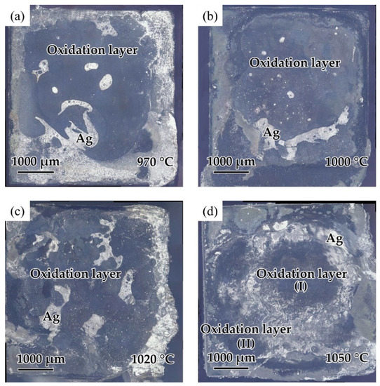 The effect of the brazing temperature on the shear strength of the brazed TiAl joints is shown in Figure 11. It can be indicated that the shear strength of the joints first increased and then decreased with the increase of brazing temperature. The shear strength value reached the maximum value of 30.8 MPa at the brazing temperature of 1020 °C. Combining with the above analysis of the microstructure of the joint, it can be concluded that the insufficient spread of the filler on the TiAl substrate at low temperature reduced the bonding strength of the joint. With the increase of brazing temperature, the brazing seam was gradually filled to form a complete joint, improving the strength. Figure 12 shows the fracture morphology of the joint brazed at different temperatures for 20 min. The fracture surface brazed at 970–1020 °C was flat and the surface was mainly the oxide layer with a small amount of Ag distributed on the surface. The fracture occurred mainly in the oxidation layer, indicating that the strength of the oxidation layer was lower than that of the brazing seam center mainly composed of Ag. The oxidation layer was the weak part in the joint. Figure 12d shows the fracture face of the joint brazed at 1050 °C. It can be seen that multiple layers presented on the fracture face. The two oxidation layers come from both sides of the brazing seam. As Ag can be found in the thicker oxide layers when the brazing temperature reached 1050 °C, it can be indicated that cracks might be generated, deteriorating the mechanical properties of the joint.