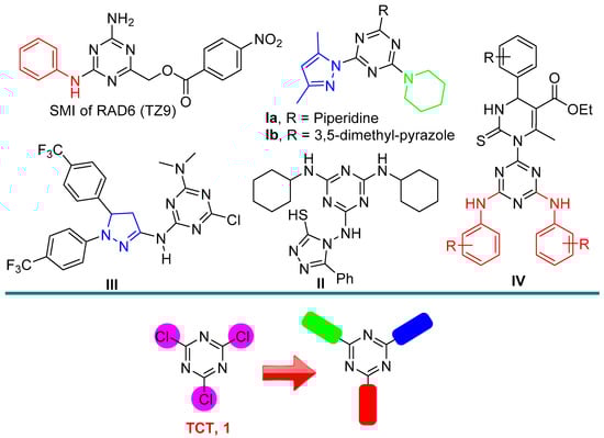 Several examples that have been reported in the literature have showed that replacement of the three chlorine atoms in the 2,4,6-trichlorotriazine (TCT) with different N-heterocycles or amines are an important task and exhibited several applications [22,23,24] (Figure 1). For example, El-Faham et al. have been designed and synthesized in a series of s-triazine hybrids comprising mon-/di-pyrazolyl along with piperidine moiety, which were subsequently assessed in vitro towards cancer activity and also in vivo toxicity in zebrafish embryos [25] (Compound I, Figure 1).