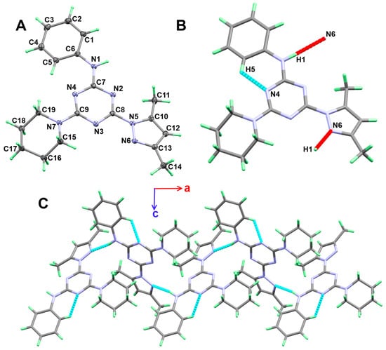 The molecular structure of 5a is stabilized by C-H…N intramolecular hydrogen bond between the one C-H bond from the phenyl moiety as hydrogen bond donor and the neighbouring nitrogen atom from the s-triazine core. The donor–acceptor distance of the C-H…N intramolecular hydrogen bond is 2.9366(13) Å. The intramolecular C-H…N and the intermolecular N-H…N hydrogen bond contacts are shown in Figure 2B as turquoise and red dotted lines, respectively. Viewing of the supramolecular structure of 5a is shown in Figure 2C, while the hydrogen bond parameters are depicted in Table 3.