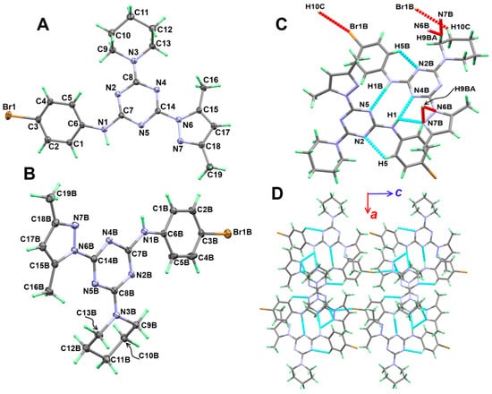 On the other hand, compound 5b in the orthorhombic system and Pbcn space group with unit cell parameters of a = 37.4570(3) Å, b = 8.62930(10) Å, and c = 24.8053(2) Å (Table 1). The unit cell volume is 8017.76(13) Å3 with Z = 16 and two molecules as an asymmetric unit. The structure of the two molecular units of 5b is shown in Figure 3A,B. Moreover, the structure comprised three rings connected with the s-triazine core, which are the p-bromoaminophenyl, pyrazolyl, and morpholine moieties. The morpholine moiety also occurred in the chair form. In this case, the twists of the phenyl ring moiety from the mean plane passing through the s-triazine core are found more than in 5a in unit A (29.44°) and less in unit B (10.46°). The corresponding values for the pyrazolyl moiety are 8.22 and 7.17°, respectively.