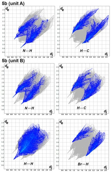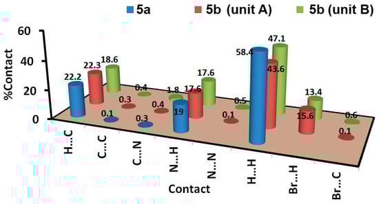 The structure of 5b comprised an extra Br atom attached at the 4-position of the phenyl ring. Hence, more intermolecular interactions were detected in this compound (Figure 4). Since there are two different molecular units per asymmetric formula, there are two sets of results for this molecular system. Based on Hirshfeld calculations, and similar to 5a, the H…H, N…H and H…C are the most dominant contacts. In addition, there is significant amount of Br…H contacts. The H12B…C8 (2.632 Å), N5…H1B (2.055 Å), H4B…H4B (1.795 Å), and Br1B…H10C (2.902 Å) are the shortest contacts, respectively. All four of these contacts appeared as a red region in the dnorm map (Figure 5). An important difference between the two molecular units of 5b is that the Br…H and H…H interactions are more important in the molecular unit with the letter B in the atom numbering than the other unit. Moreover, the percentages of the H…H, Br…H, and H…C contacts are also different in both units (Figure 7).