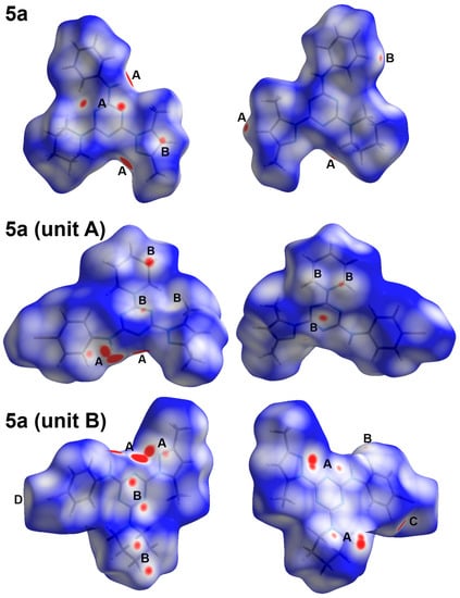 The intermolecular interactions play important role in the crystal stability. In this regard, the different contacts in the crystal structures of 5a and 5b were analysed with the aid of Hirshfeld calculations. These contacts and their percentages are summarized in Figure 4. For 5a, the structure contains three elements which are C, H, and N. Hence, the C…C, C…H, C…N, H…H, N…H and N…N are the only possible contacts. Of these interactions, only five contacts occurred, which are H…C, H…H and N…H. Their percentages are 22.2, 58.4, and 19.0%, respectively. Hence, the H…H, N…H and H…C contacts are the most dominant. Among these contacts, the N…H and H…C are the most important, based on the dnorm map shown in Figure 5. These are the only contacts which appeared as red regions, indicating shorter distances than the van der Waals (vdWs) radii sum of the interacting atoms.