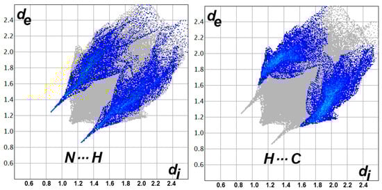 Another piece of evidence which confirms the importance of these contacts is the sharp spikes that appeared in the decomposed fingerprint plots of the N…H and H…C contacts. The sharp spikes indicate significantly short interactions (Figure 6). Summary of the short N…H and H…C interactions having distances smaller than the vdWs radii sum of the interacting atoms are listed in Table 4.