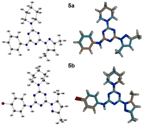 Both of the studied systems comprised CHN backbone and differ only in the substituent attached to the phenyl moiety. Graphical presentations of the natural charges at the different atomic sites are shown in Figure 10. The N atoms of the triazine core and the aniline moiety are more electronegative than the N-atoms of pyrazolyl and piperidinyl moieties in both compounds (Table S2; Supplementary data). The C-atoms of the CH3 groups are the most electronegative C-sites. In contrast, all C-atoms bonded to nitrogen have high positive charge. Of C-atoms, the s-triazine C-atoms are the most electropositive, as these carbons found located between two nitrogen sites in the s-triazine moiety. Moreover, all hydrogen sites have a positive charge where the NH protons are the most positively charged. The natural charge values are calculated to be 0.434 and 0.443 e for 5a and 5b, respectively. In the right part of Figure 11, the molecular electrostatic potential (MEP) maps of both compounds are shown. The red regions are related to the atomic sites with high electron density, while the blue regions are related to the atomic sites with lowest electron density, which represents the most possible sites as hydrogen bond acceptor and donors, respectively.