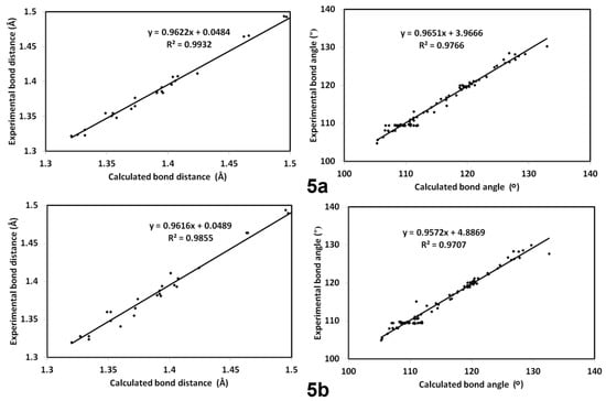 The calculated optimized structures of 5a and 5b agreed very well with the reported X-ray structures, as indicated from the excellent matching between them (Figure 8) as well as the excellent correlations between the calculated and experimental bond distances and angles (Figure 9). In addition, the differences between the calculated and experimental bond distances are found to not exceed 0.01 Å (Table S1; Supplementary data). Moreover, the correlation coefficients (R2) are calculated to be very close to unity (Figure 9). Some higher deviations occurred in the bond angles, which could be attributed to the relaxation of the molecular structure as a consequence of the geometry optimization in the absence of the crystal packing effect. Generally, the differences between the calculated and experimental bond angles did not exceed 2.8˚ (Table S1; Supplementary data).