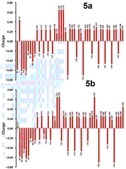 The HOMO and LUMO energies are presented in Table 5. The molecular reactivity parameters such as electrophilicity index (ω = μ2/2η), electron affinity (A = −ELUMO), ionization potential (I = −EHOMO), hardness (η = (I−A)/2), as well as chemical potential (μ = − (I + A)/2) reactivity indices, were calculated based on the HOMO and LUMO energies [41,42,43,44], and the results are also listed in Table 5. The ionization potential and electron affinity values of 5b are lower than 5a. In contrast, the chemical hardness, chemical potential, and electrophilicity index have higher values for 5b than 5a.