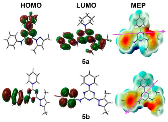 Moreover, the substituent at the phenyl moiety has a direct impact on the distribution of the HOMO and LUMO levels on the studied molecular systems. In case of 5a, the HOMO level is mainly located over the s-triazine core and the piperidinyl fragment, while the LUMO is distributed over the π-system of the s-triazine core, phenyl, and pyrazolyl moieties. In this case, the HOMO-LUMO energy gap is calculated to be 4.917 eV. On the other hand, the HOMO and LUMO are mainly located over the phenyl moiety in case of 5b. The HOMO has some distribution over the s-triazine core, where the HOMO-LUMO energy gap is slightly less in 5b (4.804 eV) compared to 5a.
