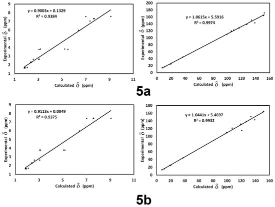 The calculated HNMR and CNMR chemical shifts by empolying GIAO method and final data are listed in Supplementary Materials in Tables S3 and S4. Figure 12 presented the correlations between computed NMR chemical shifts with experimental data. As we observed from the presented graphs, the correlation coefficients (R2) are high and close to 1. The R2 values range from 0.93 to 0.94, indicating the close agreement between the computed and experimental results.