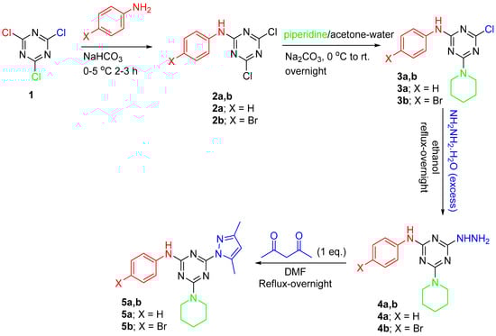For the synthesis of mono-pyrazole s-triazine derivatives 5a,b, a solution of acetyl acetone (1.2 equiv.) in DMF was added to a stirring solution of monohydrazino s-triazene derivative 4a,b (1 equivalent) in DMF at rt. The reaction mixture was treated with triethylamine (0.8 equiv.) and was allowed to reflux while stirring overnight. It was noticed that the reactivity of bromo-hydrazino s-triazine derivative 5b was relatively lower than that of the other hydrazino s-triazine derivatives, which required starting with excess amounts of acetylacetone (1.8 equiv.) and triethylamine (1.2 equiv.) for each equivalent of 4b. After completion of the reaction as identified by TLC analysis (ethyl acetate/hexane 5:5), it was allowed to cool down to rt., and then a small amount of ice-cold water was added with continuous stirring for 30 min. Thereafter, the reaction mixture was placed into an ice bath for 1 h and the precipitate of the product was separated by filtration and washed with several portions of ice-cold water and then dried overnight under vacuum to afford the product a very good yield. Some of the final products needed further purification by column chromatography on silica gel (gradient 20–60% EtOAc in hexane).