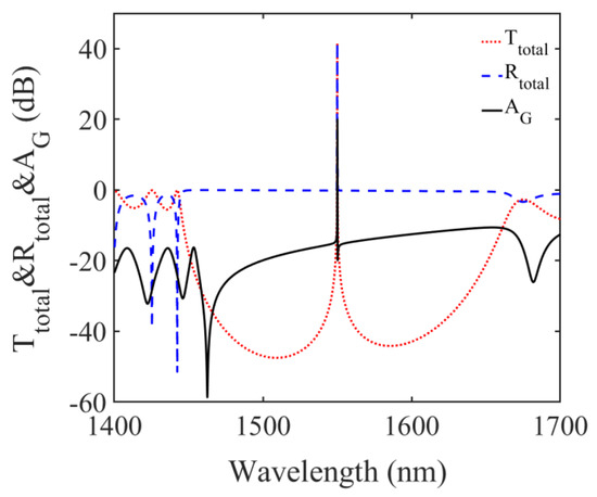 In order to satisfy the PT-symmetry condition and generate the defect mode at 1550 nm, in numerical calculation, the thickness of the A and B layer is set to dA = dB = 524.28 nm for the underlying PT-symmetry PC; the macroscopic Lorentzian oscillation intensity in the gain–loss layer is set to αB = −2.1 × 10−4 and αA = 2.1 × 10−4. The thickness of dielectric layer D is adjusted to dD = 455 nm, the dielectric layer C can be observed as the defect layer of the entire structure, and its thickness is set to dC = 2dD; without applied modulation electric field, the refractive index of D or C layer is n0 = 2.286. The chemical potential is μ = 0.3 ev, and the thickness is dG = 0.34 nm for the monolayer graphene. The PT-symmetry PC structure period is N = 6, and other structure parameters are provided in Section 2. Figure 2 plots the transmission and reflection spectra of the entire structure and the absorption spectra of the monolayer graphene. In order to more intuitively present the transmission and reflection of the structure and the absorption of graphene layers at different wavelengths, here, a logarithmic transformation, with dB as the unit, is taken for the calculation, and the conversion relationship can be written as follows: Y(dB) = 10lgY, where Y can represent transmission, reflection of the structure, and the absorption of graphene layers.