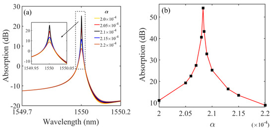 (a) The absorption spectrum of graphene with different α values; (b) variation in the absorption at 1550 nm as a function of α.