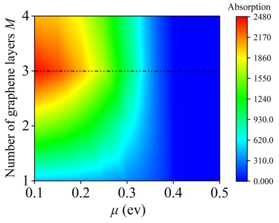 It can be observed from Figure 4 that for a constant graphene chemical potential value, the absorptance reaches the maximum when the number of graphene layers reaches three. Meanwhile, the absorptance of different layers decreases gradually with an increase in chemical potential. Graphene absorption precipitately drops to nearly zero when the chemical potential approaches 0.4 ev. When the chemical potential is greater than 0.4 ev, the graphene layer absorptance tends to zero and does not change any longer. Table 1 shows the absorptance of graphene at different chemical potentials when the number of graphene layers taken is three.