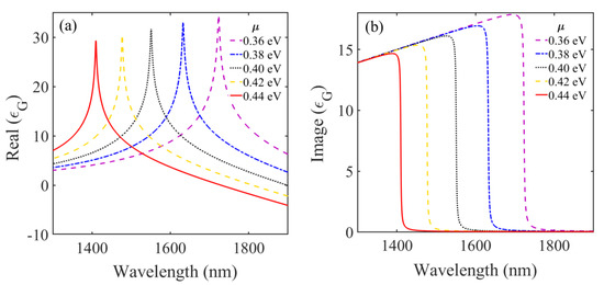 In order to account for this phenomenon more intuitively, in Figure 5, we plotted the variation curves of the real and imaginary parts of the graphene dielectric constant with the wavelength (the chemical potential changing from 0.36 ev to 0.44 ev in steps of 0.02 ev). For different chemical potentials, the spike in the real part of the graphene dielectric constant corresponds to the sudden fall of the imaginary part, which is shown in Figure 5a,b. Furthermore, as the chemical potential decreases, the features (the spike and the sudden fall dot) of the real and imaginary parts of the graphene permittivity have a quick redshift in the investigated wavelength range from 1300 nm to 1800 nm. Simulation results show that when μ = 0.42 ev, the feature of the real and imaginary parts corresponds to the wavelength of 1550 nm, which is the dominating reason for rapid decrease in graphene absorption at 1550 nm.