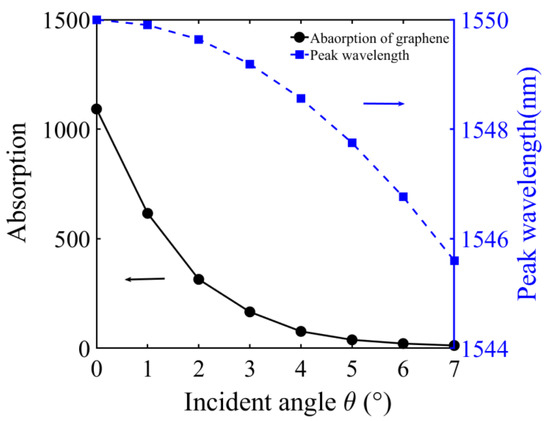 The incident angle is a momentous factor affecting the absorptance of graphene. When the incident angle θ changes, the position of the defect mode will deviate from the strong coupling point of the PT-symmetry structure, and then the coupling effect of the bottom PT-symmetry PC will also change, which is the reason for the changes in the graphene absorption patterns (the position and absorptance). Based on the high sensibility of graphene absorption on incident angle θ, 1° is the angle interval set in the calculation. The chemical potential μ and the number of graphene layers M in our numerical simulation are be fixed at 0.3 ev and 3, respectively. The influences of the incident angle on the absorptance and absorption peak position of the structure GM(ACB)ND(BCA)N are investigated and plotted in Figure 6, respectively.