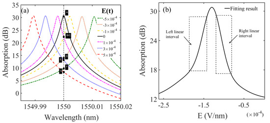 It can be straightforwardly observed from Equation (3) that the refractive index of the LiNbO3 crystal is related to the applied electric field. Accordingly, the electro-optic modulation based on LiNbO3 is primarily realized by adjusting the intensity of applied electric field. First, the variation range of electric field along the y-axis is selected from −5 × 10−4 to 5 × 10−4 V/nm. At different modulation electric field values, the absorption spectra of graphene are plotted, as shown in Figure 7a. Then, we plotted the best fit of the graphene absorption at 1550 nm (from A to G in Figure 7a) based on the second-order Gaussian fitting, which is shown in Figure 7b.