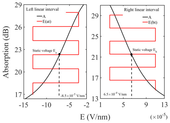 We can, through the study, obtain that of the two linear intervals near the peak value in Figure 7b, the absorption of graphene exhibits an identical trend with the increase in modulation electric field E(t) in opposite directions. Based on the electro-optic modulation of LiNbO3, reversible modulation of graphene absorption can be achieved. First, a static bias electric field (Ea or Eb shown in Figure 8) was elaborately selected in two linear intervals. On that basis, the square-wave modulation electric field signal is the input, and the value of the square-wave electric field can be set according to the range of the linear interval. Accordingly, in two linear intervals, the bias electric field acting on LiNbO3 can be expressed as Ea+E(at) and Eb+E(bt).
