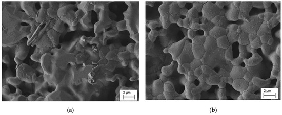 As can be seen from the SEM images, both undoped BaGa2O4 ceramics (Figure 2a) as well as ceramics with 1 mol.% Eu3+ ions (Figure 2b) have a fairly branched structure of grains, grain boundaries and pores of different forms and shapes [45]. Samples of these ceramics are characterized by a small grain size and homogeneity in the morphology of the structure. The presence of Eu3+ ions leads to an increase in the pore size of the initial BaGa2O4 ceramics, the formation of grain agglomerates and their further growth. In addition, in both cases there is the formation of micro- and nanosized crystals on the grain surface.