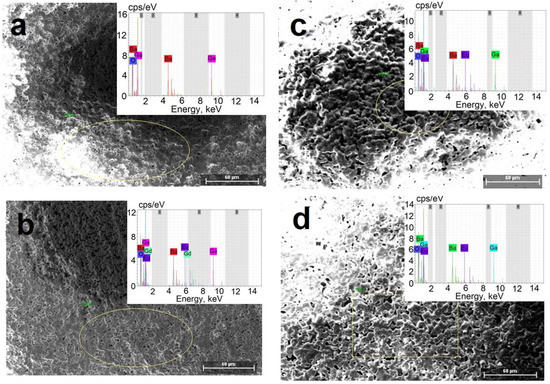 In addition, the elemental composition of the studied ceramic samples was evaluated using the method of energy-dispersion X-ray (EDX) spectroscopy for selected areas (Figure 3).