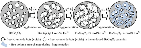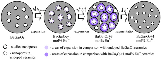 The third long-term component of the PAL spectrum (the second channel of positron annihilation with lifetime τ3 and intensity I3) is associated with the o-Ps decaying in nanopores [45]. As can be seen from Table 3, lifetime τ3 and intensity I3 increase with Eu3+ content in the BaGa2O4 ceramics (to 3 mol.%). However, when the amount of Eu3+ ions rises to 4 mol.%, the lifetime τ3 decreases and the intensity I3 continues to increase. It is obvious that the presence of Eu3+ ions in the ceramic matrix leads to the expansion of nanosized pores and an increase in their number. However, the supersaturation of ceramics with doped ions (to 4 mol.%) results in the fragmentation of nanopores. The obtained trends are reflected in the radius of nanopores R3 (Table 4) calculated using the Tao–Eldrup model. This process is schematically shown in Figure 5.