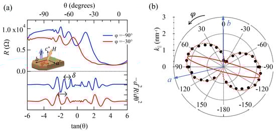 Figure 1b shows the temperature dependence of the interlayer resistance for the -SF salt. The resistance decreased monotonically with decreasing temperature. At ∼4.8 K, a sudden drop in resistance was observed due to the superconducting transition. Below ∼4 K, the resistance was zero within the noise level. To investigate the 2D Fermi surface structure, we first measured the AMROs in various rotation planes. Typical AMRO data are presented in Figure 2a. The angles and are defined in the inset. The characteristic dependence of the interlayer resistance is shown in the upper part of Figure 2a. In the negative second derivative curves, we can observe AMROs, which are periodic with tan(), as shown in the lower part of Figure 2a. The AMRO period directly yields the reciprocal lattice vector , values. Figure 2b shows the polar plot of obtained from the AMRO measurements at various . We can draw the cross-section of the 2D Fermi surface, inscribed in the () curves, by a solid curve, assuming an elliptical shape. The cross-section of the Fermi surface is very elongated, whose area was ∼6% of the first Brillouin zone. The AMRO results were almost consistent with those of previous reports [39].