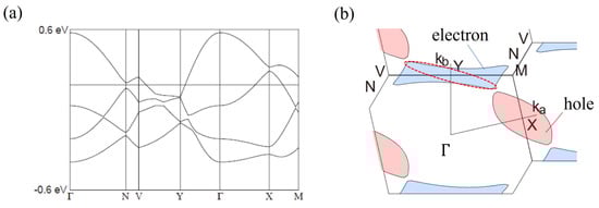 In Figure 3a, we present the band calculations by an extended Huckel method [40], using lattice parameters obtained from X-ray crystallography [38]. The calculated 2D Fermi surface is depicted in Figure 3b. The results are different from the reported Fermi surface structure, with a pair of 1D Fermi surface and a closed Fermi surface [38,41], in which the Brillouin zone is apparently wrong. In our calculations, there were two pockets with different carriers: a deformed square electron pocket and an elliptic hole pocket. The areas were equal to each other, and a compensated metal was formed. This is consistent with a single frequency of the quantum oscillation [42,43,44]. For comparison, the Fermi surface obtained from the AMRO measurements is indicated by a red dotted curve, which is almost consistent with the electron pocket. In the AMRO measurements, the hole pocket was not observed. The reason for this is not clear at present.