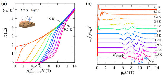 Figure 4a shows the magnetic field dependence of the interlayer resistance at various temperatures. The field was applied parallel to the b axis, in the superconducting –b plane, within the accuracy of 0.1°. At 0.5 K, the resistance increased with the field above 6.5 T, defined as . Characteristic corrugation was evident. The corrugation was reduced with increasing temperature. The critical field was determined as 13 T at 0.7 K from the specific-heat measurements [23]. The finite resistance in the wide field region below can be ascribed to the motion of the JVs in the insulating layers, as has been observed in various organic superconductors [15,28,29]. To clearly see the corrugations in detail, negative second-derivative curves of the resistance are plotted in Figure 4b. At 0.5 K, we see a broad dip at ∼6.5 T, corresponding to the resistance increase from the noise level. Above ∼8 T, we see a quasi-periodic dip structure, which is most pronounced at ∼10 T. This structure can be ascribed to the CM effect, which is observable only in the FFLO phase, as discussed in the previous reports [29]. At higher fields, the CM effect is reduced and vanishes above ∼12 T, which corresponds to the melting transition of the JV lattice. As temperature increases, the dip structure is suppressed and shifts to a lower field region. Above 2.1 K, such astructure is not evident. As has been discussed [27,29], the dips mean relatively strong pinning of the JV lattice, ascribed to the CM effect between the JV lattice and the periodic nodal structure of the gap .