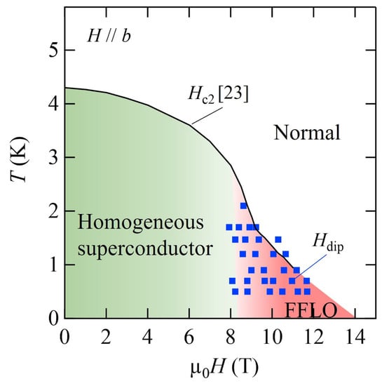 From the above results, we obtained the temperature–field phase diagram shown in Figure 5. The blue squares indicate the dip fields , and the solid curve indicates , which was determined from specific-heat measurements [23]. The FFLO phase appears in a wide region above ∼8 T and below ∼2 K. The phase diagram is very similar to that for the -axis [29], although the Fermi surface was anisotropic.