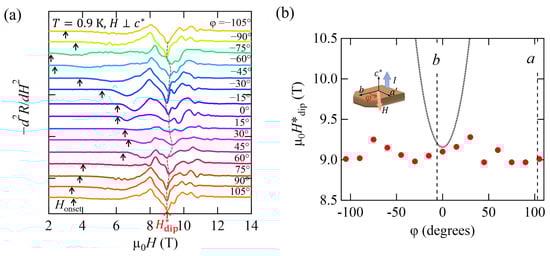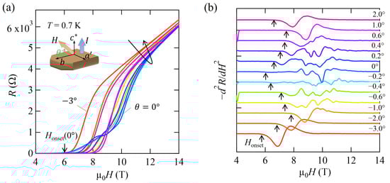 Figure 6a shows the magnetic field dependence of the resistance at various field angles . For = 0°(-axis), the resistance increased with the field above = 6 T, which is indicated by an arrow. Figure 6b shows the negative second-derivative curves of the resistance. The low value for = 0°, denoted by an arrow, indicates that only JVs were formed (no PVs), which were pinned very weakly in the insulating layers. When the field was tilted from the superconducting layer, increased. This behavior is explained by the stronger pinning of the flux lines in the superconducting layers, where PVs are formed. As the field was further tilted, was steeply reduced, leading to a decrease in . For = 0°, small dips due to the CM effect can be seen above ∼9.5 T. As the field was tilted from the layer, the CM effect was suppressed, and no CM effect was observed for 0.6°. The stability of the FFLO phase in such a small angle region is consistent with the results for the field almost parallel to the a axis [29].