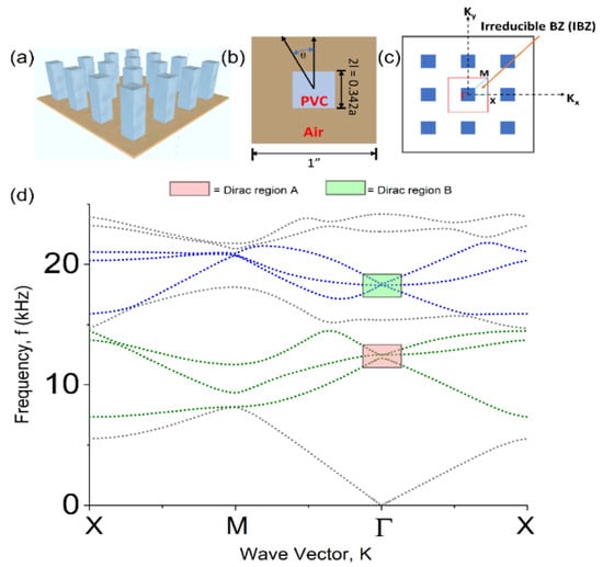 It is known that the generation of a triply degenerated point at the center of Brillouin zone (BZ) or Γ point is the result of accidental degeneracy. A tunable engineered PnCs system is proposed [20], where multiple Dirac-like points can be generated at Γ point by tuning the orientation of the solid resonator. PVC rods with dimension s = 0.342a and filling fraction = 0.1169, where a = lattice constant ≈ 25.4 mm, shown in Figure 1a are considered in this study. The first BZ (Figure 1b), which is the entire red square inside the supercell of Figure 1c, is reduced to a smaller region, ΓMX to be the irreducible BZ due to the lattice symmetry [26]. The acoustic dispersion curves are obtained along the periphery of the irreducible BZ (ΓMX) as shown in Figure 1d. Here, multiple regions are observed where a doubly degenerated mode and a single mode coexist. Two regions, named as “Dirac region A” (DRA) and “Dirac region B” (DRB) are selected for further tracking through tuning of the PnCs. It is to be noted that DRB is very close to a triply degenerated state, while DRA has apparent double degenerated state with a nearby single band with a partial BG between them. Therefore, to achieve DDC at two distinct energy states, a specific configuration of the PnCs, where both DRA and DRB are triply degenerated, needs to be found.