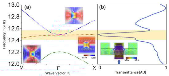 In this study, square PVC rods of infinite length are arranged in a square array. Initially, the rods have no rotation (i.e., ) with respect to lattice orientation (Figure 1b). It is shown that with a careful tuning of the structure by rotating the lattices counterclockwise, the dispersion behavior helps to get triply degenerated at multiple frequencies at the Γ point (center of the BZ). Close observation of both the regions (DRA and DRB) reveals that the bands (red in Figure 2a), which are near-flat or parallel to the wave vector axis, are the “deaf bands”. The blue and the green bands are designated as T band (Top bands) and B band (Bottom bands), respectively. To prove the deafness of the deaf bands, the acoustic pressure mode shapes and the solid deformations of the PVC rods at DRA are presented in Figure 2a. With close observation, it is apparent from the mode shapes that the T and B bands are mutually orthogonal, with quadrupolar mode shapes. They hold proper symmetry with respect to the incident plane wave along ΓX [100] and MΓ [010] directions. However, both the deaf bands are antisymmetric with respect to the incident wave direction, lacking group velocity. In Figure 2b, the transmission study validates the deafness of the band, showing almost zero transmission near the deaf band. Thus, the deaf band remains inert to any kind of normal-incident plane wave due to antisymmetry. The concept of pivoting on the deaf bands and achieve Dirac-like cones at respective frequencies is a relatively new concept, and it is presented herein by performing a rotational tuning of the PnCs simultaneously at multiple frequencies.