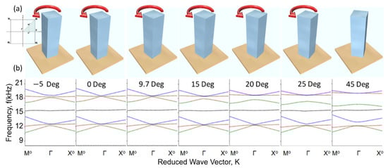 - Dong, H.; Wu, F.; Zhong, H.; Zhang, X.; Yao, Y. Effects of asymmetrical rotated rectangular basis on the acoustic band gap in two-dimensional acoustic crystals: The bands are twisted. J. Phys. D Appl. Phys. 2010, 43, 105404. [Google Scholar] [CrossRef]