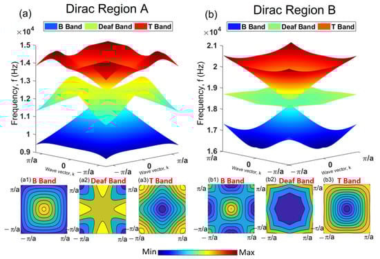 In Figure 3a, unit cells with different angular rotation of the PVC rod and their respective dispersion behavior are presented in a sequence. Only DRA and DRB areas are shown in Figure 3b with incremental angular tuning with increasing angle of rotation (counterclockwise rotation). The B band at DRA experiences a significant alteration with respect to the energy state (frequency), whereas the doubly degenerated T band and the deaf band energy state remain approximately fixed with respect to the frequency axis. At θ = 9.7°, the counterclockwise angular rotation guarantees triple degenerated states at DRA forming a local linear dispersion. On the other hand, the DRB has very close triply degenerate state from the beginning (θ = 0°) and protects the triple degeneracy at θ = 9.7°. Hence, this establishes that two full triply degenerated points at the center of BZ are achieved with DRA and DRB at a tuning angle θ = 9.7°. In the literature, Quadro-degenerated points were reported before, where four bands intersected at a Dirac point, calling it a double Dirac-like cone [39,41,42]. However, in this case, six bands are involved in generating two Dirac cone locations at two distinct frequencies. Henceforth, this deaf band-based optimized formation of Dirac-like cone has been named as “Dual-Dirac-like cones” (DDC). Figure 4a,b presents both the Dirac-like cones (at θ = 9.7°) and present 3D equifrequency surfaces (EFS) for B band, deaf band and T band, respectively (Figure 4(a1–a3,b1–b3)). Concentric circular shapes of EFSs indicate the existence of Dirac-like cones. With close observation, it is found that for both DRA and DRB with a tuning angle θ = 9.7°, the B band has a small but equal bandgap from the doubly degenerated state formed by a T band and the deaf band. It is found that to prevail Dirac cone behaviors, the above band structure is necessary, whereas the converse is not true. The converse occurs when the B band is degenerated with a deaf band, and the T band is lifted, leaving a bandgap.