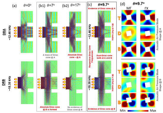 A periodic arrangement having 58 × 9 solid PVC square rods of filling fraction, f = 0.1169, are placed in the air medium. Acoustic pressure field distributions for both the DRA and DRB regions are presented in Figure 5. Acoustic pressure modes along ΓX and MΓ for all the bands of DRA and DRB are shown in Figure 5 as well. The actuation of the periodic square PnCs was achieved by a guided plane wave source located at ~110 mm away from the air–PVC interface. A plane wave radiation boundary condition is assumed at all the boundaries to avoid unnecessary wave reflections. Triangular elements are selected for finite meshing of the simulation domain, with a maximum element size of , where is the acoustic wavelength at the maximum frequency 50 kHz. Orthogonal wave transportation at Dirac-like frequencies, can be visualized by making the arrangement portrayed in Figure 5a–c. Both Dirac regions demonstrate their respective unique features that are explained through wave-dispersion behavior below. The acoustic pressure distribution in the metastructure is shown in Figure 5a, where the PnCs are not rotated and regular arrangement of the square matrix at is demonstrated. It shows no sign of Dirac phenomena on the grid. However, when the square PnCs on the grid are rotated together at an angle , as predicted, DRB at frequency ~18.38 kHz demonstrates absolute Dirac phenomena, shown in Figure 5(b1). DRA at frequency ~12.46 kHz also shows a trace of Dirac cone behavior [43], but it is not fully developed. When the square PnCs on the grid are rotated together at an angle , as predicted, DRA at frequency ~12.46 kHz demonstrates absolute Dirac phenomena, shown in Figure 5(b2). However, the Dirac behavior at DRB is totally dispersed. As the angle of rotation increases, DRB experiences a large separation/bandgap () between the B band and the doubly degenerated T and deaf bands. This is not the case for DRA when the rotational angle is . At DRA, slowly changes due to the relative curvature of the B and deaf bands, as the angle of rotation changes between 7° and 17°. Guided by the gap between the B and deaf bands at DRA and DRB, an equal gap of ~166 Hz is identified at where the Dirac phenomena predictively prevail. To prove this, a numerical experiment was conducted at both Dirac frequencies. The acoustic pressure distribution on the grid at DRA and DRB is shown in Figure 5c, when the PnCs are rotated together at an angle . The incident plane wave propagates in the actuation direction with no distortion at f = 10 kHz (not shown), but a drastic orthogonal bent line is demonstrated when the actuation frequency increases near the Dirac-like frequency for DRA (f ~= 12.46 kHz) and DRB (f ~= 18.38 kHz), as shown in Figure 5c. Minimal acoustic energy transmits in the actuation direction, forming an apparent bandgap. Keeping the phase shift at near zero, the plane wave travels along the PnCs orthogonally with respect to the actuation direction (Figure 5c). This establishes a prominent energy shift, producing a 45° bifurcation pattern. The wave-front bends another 90° toward the original actuation direction (ΓX), keeping the plane wave-front relatively intact. Due to its antisymmetry, the deaf band exhibits strong spatial localization and allows the wave-front to propagate orthogonally.