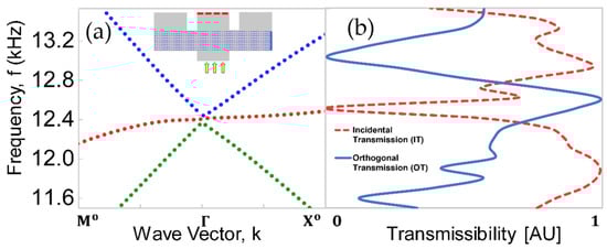 (a) The zoomed in band dispersion relation at DRA for θ = 9.7° calculated numerically, (b) a comparison of the numerical results of acoustic transmission (normalized) excited along the direction with DRA frequencies. The peak transmission is seen at the Dirac-like frequency along the orthogonal direction (OT—blue) shown in the PnCs arrangement in inset, while the transmission dip is observed along the actuation direction (IT—red) for that respective frequency, validating the phenomenon realized in Figure 5.