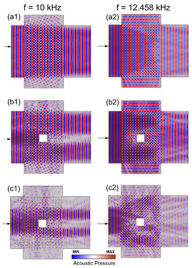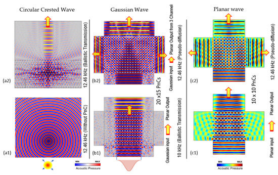 Apart from the acoustic cloaking effect, a spatial phase reconstruction along with wave-front reshaping, pseudo-diffusion and acoustic collimation have been studied in the past few years [48,49,50]. Absolute acoustic pressure field distributions are demonstrated for both incident circular waves, Gaussian waves and plane waves, respectively. First, the normalized pressure field distributions are shown at different frequencies, including Dirac frequency, from a circular-crested wave source. Studies were conducted when the PnCs were absent. Similarly, when a block of (28 × 13 grid) rotated PnCs rotated at an angle 9.7° arranged along the Γ-K direction, the circular wave was again excited at the Dirac frequency. Figure 8(a1) shows that in the absence of any periodic square PnCs at the Dirac frequency (12.458 kHz), the circular wave-front maintains the phases and the wave shape without any distortion. However, once the rotated PnCs are placed inside the air media, the propagation of the circular wave-front at that Dirac frequency (12.458 kHz) exhibits ballistic wave transmission with a collimated plane wave traveling mostly along Γ-X direction (Figure 8(a2)). This ballistic feature is identical to the one that is observed in a beam of fixed-width propagates without changing the beam width. Next, the acoustic wave transmission inside a 20 × 15 PnCs arranged with Dirac rotation of 9.7° is studied when a Gaussian wave () is excited along the Γ-X direction at a frequency of 10 kHz. The incident wave amplitude across the actuator’s width varies using a Gaussian function. The Gaussian wave input transforms into a planar wave output with equal amplitudes along the planar wave-front due to the presence of the PnCs (Figure 8(b1)). However, when the actuation frequency increases to 12.458 kHz, wave diffusion occurs, creating planar wave-fronts through all three outlets, as shown in Figure 8(b2). Surprisingly, when the smaller number of PnCs are used in the guide, wave diffusion not only happens along the orthogonal direction, but wave diffuses with planar wave-front in the incident direction. Orthogonal wave transport prevails even above ~12.46 kHz up to ~13 kHz. This is in contrast to Figure 6 obtained from a matrix of 40 × 7 elements. Hence, the presence of the number of PnCs along the orthogonal to the incident wave plays a vital role in reconstructing the phase to form collimated plane waves and wave diffusion. This may have practical applications in engineering and biomedical science when waves are required to predictively guide in fluid and solid media. Similar scenario with planar wave incident is shown in Figure 8(c1,c2) on a comparatively smaller setup with 10 × 10 PnCs, suitable for performing a laboratory experiment (not presented in this article).
