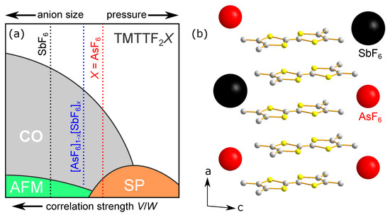 Organic charge-transfer salts are model systems realizing electronic correlations and Mott–Hubbard physics, yielding a plethora of metal–insulator transitions in many different compounds. Owing to their effectively quarter-filled bands with nominally one electron per two organic molecules, the quasi-one-dimensional Fabre salts (TMTTF)X are prone to charge-order instabilities [1]. Initially, charge order (CO) was suggested as a purely electronic effect due to intersite Coulomb repulsion. Within the extended Hubbard model, the ratio of nearest neighbor interaction V with respect to the bandwidth W is a measure of the correlation strength that can be varied by external pressure or by chemical means [2,3]. Eventually, CO is suppressed completely for sufficiently small , and an insulator–metal transition takes place, stabilizing metallic and superconducting states. At lower temperatures, more complex phase transitions to anion-ordered and spin-Peierls phases result in modifications of the magnetic and structural degrees of freedom, such as the formation of a spin gap and tetramerization of the TMTTF molecules. Previous NMR and optical studies of electronically-driven charge order provided consistent results on (TMTTF)X with centrosymmetric anions , AsF, SbF, and TaF [1,4,5,6,7,8,9,10,11,12,13] and tetrahedral anions , ReO [14,15].