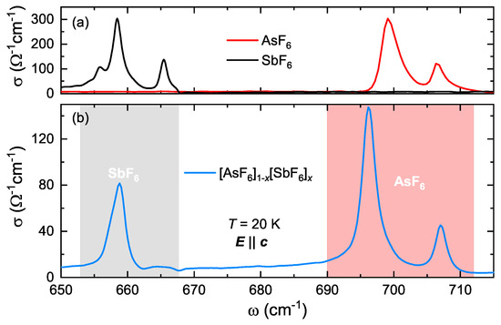 (a) The vibration modes of the anions SbF and AsF occur in the infrared spectra of (TMTTF)SbF and (TMTTF)AsF around 660 and 700 cm, respectively. (b) The spectral features of both anion species are present in the spectrum of (TMTTF)[AsF][SbF]. Through integrating the spectral weight in the grey and red shaded frequency ranges, we estimate a stoichiometry from the ratios between the intensities of the SbF and AsF modes.