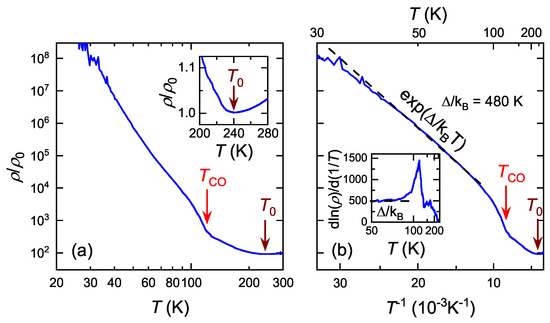 (a) Temperature-dependent electrical resistivity of (TMTTF)[AsF][SbF] with (electrical current parallel to a-axis) measured in situ during optical reflection measurements in the -plane. The sharp increase at K indicates the CO transition. The localization temperature K is a little lower compared to the parent compounds (TMTTF)AsF and (TMTTF)SbF [37], but otherwise the transport properties are qualitatively similar. (b) The Arrhenius plot yields an approximately constant energy gap K in the temperature range 40–100 K, as illustrated in the transport derivative in the inset.