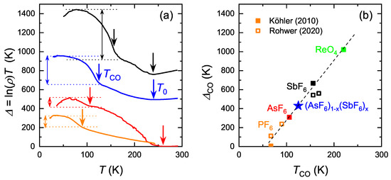 The bare value of the transport gap, however, does not reflect the CO state only, but involves also contributions from Mott localization that cause the upturn of resistivity below . These individual contributions add in quadrature establishing the total value of . To that end, we determine the CO contribution from the temperature-dependent energy gap , following the procedure applied in [37]. of (TMTTF)[AsF][SbF] is shown in Figure 5a, together with the energy gaps of (TMTTF)X with (here we show the deuterated compound with K from [39]), AsF, and SbF [37]. Note that the data have been shifted vertically and in all cases by definition. is determined from the increase of below the respective , i.e., , as indicated by the double arrows and dashed lines in respective colors in Figure 5a. From our present transport results, we obtain K for (TMTTF)[AsF][SbF].