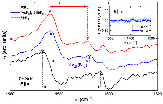 We investigate CO in (TMTTF)[AsF][SbF] in more detail by assessing the optical response of molecular vibrations in the midinfrared frequency range [1,38]. The charge-sensitive mode probed for exhibits a similar splitting in the CO phase ( K < ) as in the two parent compounds (Figure 6). According to Equation (1), the separation of the two main peaks corresponds to the charge disproportionation between charge-rich and charge-poor molecular sites, which increases from to . Overall, the mode for very much resembles the spectrum of , in agreement with the chemical composition, placing the alloy closer to (TMTTF)AsF in the phase diagram (Figure 1a). We also assessed the optical reflectivity parallel to the stacks (, see inset of Figure 6) and observe no significant activation of the mode that is sensitive to tetramerization of the TMTTF molecules [1,36]. Therefore, we find no evidence for a spin-Peierls transition in (TMTTF)[AsF][SbF] based on our optical data, in line with the magnetic susceptibility measurements shown in Figure 3. The suppression of the spin-Peierls state is in agreement with pressure-dependent experiments on (TMTTF)SbF and (TMTTF)AsF, where antiferromagnetism rapidly replaces the spin-gapped phase [6,35,36].