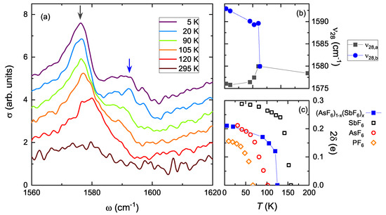 - Knoblauch, T.; Dressel, M. Charge disproportionation in (TMTTF)2X (X = PF6, AsF6 and SbF6) investigated by infrared spectroscopy. Phys. Status Solidi C 2012, 9, 1158–1160. [Google Scholar] [CrossRef]