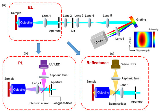 Schematic of the multifunctional snapshot ARS system for (a) EL, (b) PL, and (c) reflectance measurements. The parallel rays of different angles entering the system form a 2D image with the angle information in the vertical dimension determined by a fine slit and the wavelength information in the horizontal dimension determined by a blazed grating, which is then captured by a CMOS camera.
