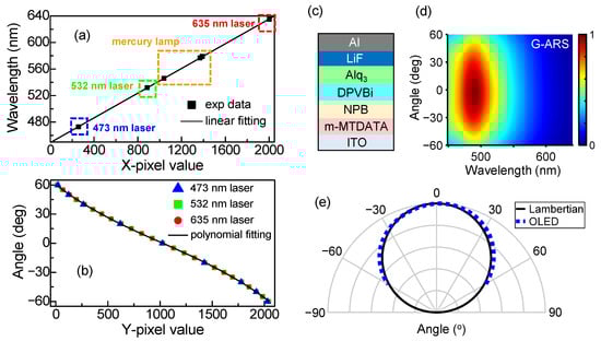 (a) Wavelength dimension (x-axis) of the CMOS image calibrated using the Hg-Ne lamp and laser diodes as the light source. Their respective wavelengths and the extracted x-pixel values follow a linear relationship, determining the entire detected wavelength range from 449 nm to 641 nm. (b) Angle dimension (y-axis) of the CMOS image calibrated by varying the incidence angle of laser beam from −60° to 60° relative to the optical axis of the system. The angles and the y-pixel values are well fitted to a 3rd order polynomial curve and are independent of wavelength. (c) Schematic of the blue-green OLED used for EL intensity calibration, not to scale. (d,e) Angle-resolved EL spectra and radiation pattern of the blue-green OLED measured with a goniometric spectrocopy system.