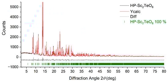Rietveld refinement was accomplished with the software package DIFFRACplus-TOPAS 4.2 (Bruker AXS, Karlsruhe, Germany). The refinement was based on the single-crystal structure model and the peak shapes were optimized using modified Thompson–Cox–Hastings pseudo-Voigt profiles [,]. The lattice parameters derived from the refinement are comparable with those received by single-crystal X-ray diffraction (see Table 1). Moreover, theoretical powder pattern calculated from the single-crystal data fits well to the measured powder pattern, which proves the purity of the HP-Sc2TeO6 specimen (see Figure 1).