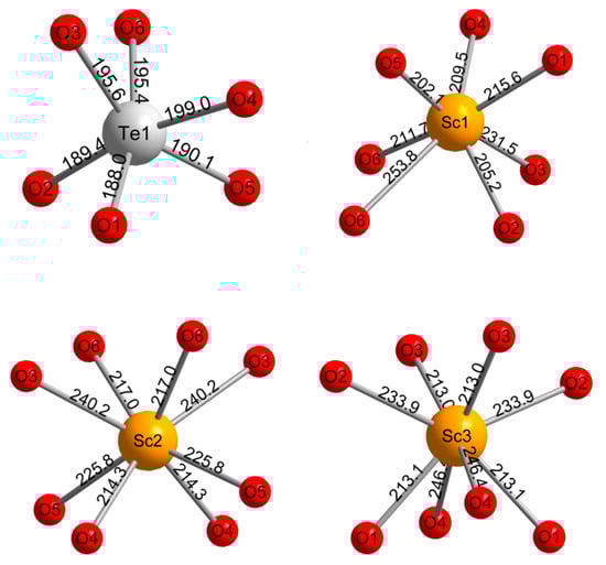 HP-Sc2TeO6 forms at high-pressure/high-temperature conditions of 12 GPa and 1173 K from the normal-pressure precursor compound. It crystallizes in the monoclinic space group P2/c (no. 13) and is isostructural to Yb2WO6 []. The Te6+ cations are distorted octahedrally coordinated by six oxygen ions, whereas Sc1 is coordinated by seven oxygen ions as a capped trigonal prism. Sc2- and Sc3-atoms are distorted quadratic antiprismatically coordinated by eight oxygen ions. All coordination geometries with given atom distances are displayed in Figure 3.